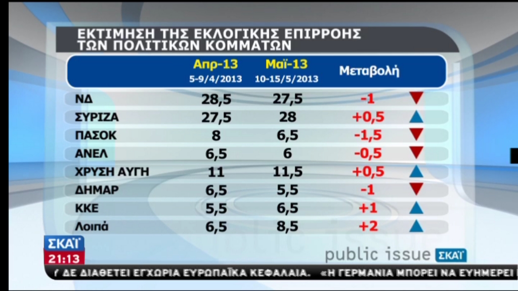 Ρευστό είναι το πολιτικό σκηνικό, καθώς σύμφωνα με Βαρόμετρο Μαΐου της Public Issue για τον ΣΚΑΪ και την Καθημερινή, στην εκτίμηση εκλογικής επιρροής ο ΣΥΡΙΖΑ προηγείται μόλις με 0,5%. Αντίθετα, στην παράσταση νίκης προηγείται η ΝΔ, ενώ παραμένει καταλληλότερος πρωθυπουργός ο Αντώνης Σαμαράς.