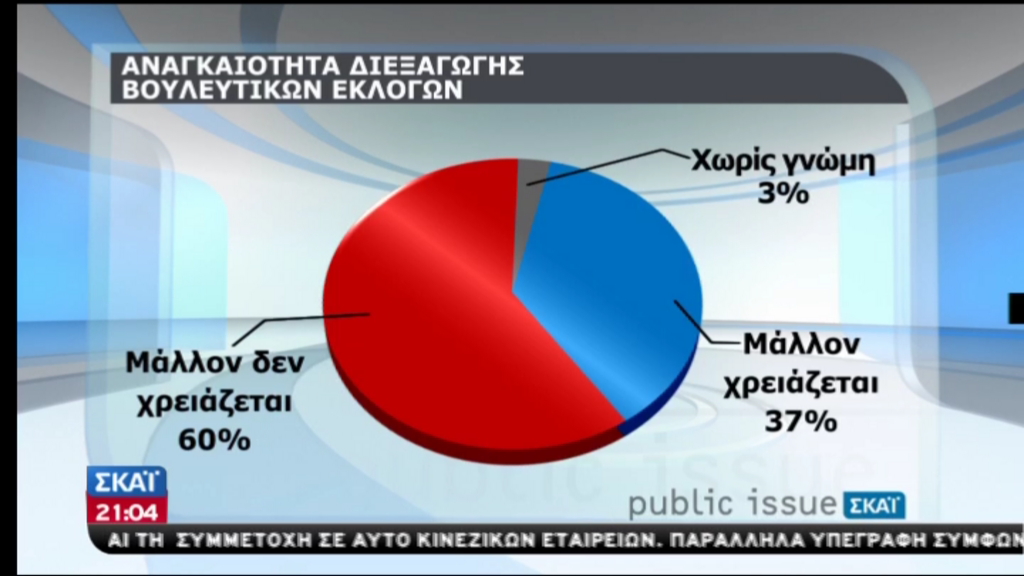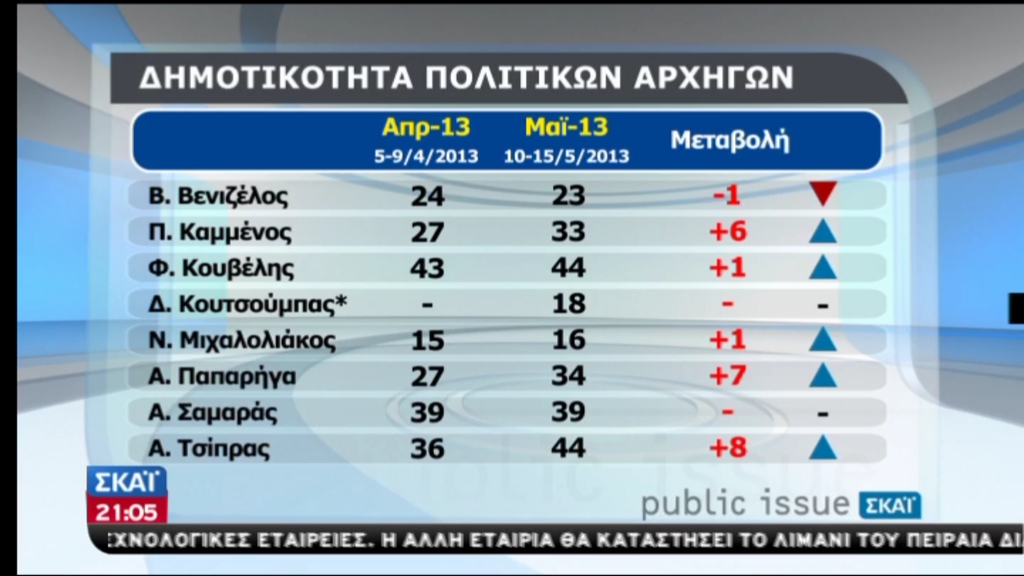 Ρευστό είναι το πολιτικό σκηνικό, καθώς σύμφωνα με Βαρόμετρο Μαΐου της Public Issue για τον ΣΚΑΪ και την Καθημερινή, στην εκτίμηση εκλογικής επιρροής ο ΣΥΡΙΖΑ προηγείται μόλις με 0,5%. Αντίθετα, στην παράσταση νίκης προηγείται η ΝΔ, ενώ παραμένει καταλληλότερος πρωθυπουργός ο Αντώνης Σαμαράς.