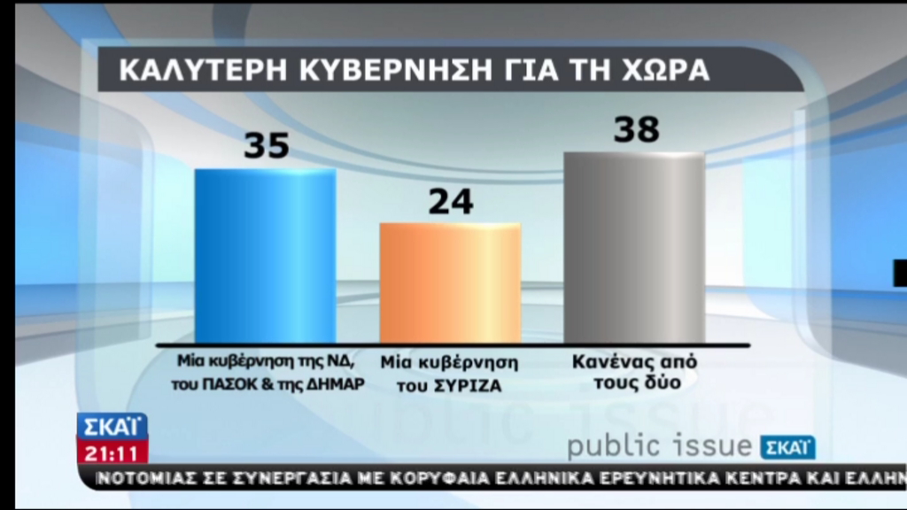 Επίσης, το 35% θεωρεί ως καλύτερη κυβέρνηση για τη χώρα μία τρικομματική κυβέρνηση ΝΔ,ΠΑΣΟΚ και ΔΗΜΑΡ, και το 24% θεωρεί ως καλύτερη για την Ελλάδα μία κυβέρνηση του ΣΥΡΙΖΑ. Παράλληλα, το 60% εκτιμά ότι μάλλον δεν χρειάζεται να γίνουν εκλογές.
