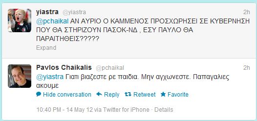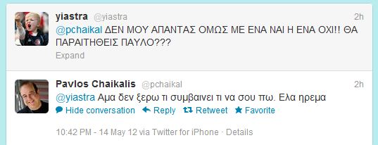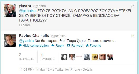 Ο Παύλος Χαικάλης που εξελέγη βουλευτής με τους Ανεξάρτητους Έλληνες, παρακολούθησε με αγωνία, την συζήτηση για το έγγραφο που διέρρευσε από την Προεδρία της Δημοκρατίας. Στις επίμονες ερωτήσεις ενός χρήστη του twitter απάντησε με σιγουριά,ότι γνωρίζει τι συμβαίνει και πως είναι σίγουρος για τους χειρισμούς του Πάνου Καμμένου. ” Αν ο Πρόεδρος σου συμμετέχει σε κυβέρνηση που στηρίζει Σαμαράς και Βενιζέλος θα παραιτηθείς;” επιμένει για τρίτη φορά ο χρήστης του twitter και ο Παύλος Χαικάλης απαντά : “Ναι θα παραιτηθώ. Τώρα ξέρω. Γι αυτό απαντάω”. ΔΙΑΒΑΣΤΕ ΤΟΝ ΔΙΑΛΟΓΟ