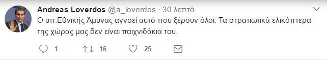 «Ο υπουργός Εθνικής Άμυνας αγνοεί αυτό που ξέρουν όλοι: Τα στρατιωτικά ελικόπτερα της χώρας μας δεν είναι παιχνιδάκια του», ανέφερε χαρακτηριστικά στην ιστοσελίδα κοινωνικής δικτύωσης, ενώ στη δήλωσή του υποστήριξε ότι «τα ελικόπτερα του Ελληνικού Στρατού δεν είναι παιχνιδάκια στα χέρια του εκάστοτε κυβερνώντος. Αυτό οφείλουν να το γνωρίζουν ο Πρωθυπουργός και οι υπουργοί της Κυβέρνησης και πρώτος απ’ όλους ο υπουργός Εθνικής Άμυνας».