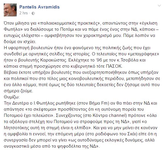 Με ανάρτησή του στο Facebook o γραμματέας Οργανωτικού του Ποταμιού Παντελής Αβραμίδης ασκεί δριμεία κριτική στον ανεξάρτητο, πλέον, βουλευτή Ιάσονα Φωτήλα σημειώνοντας μεταξύ άλλων: