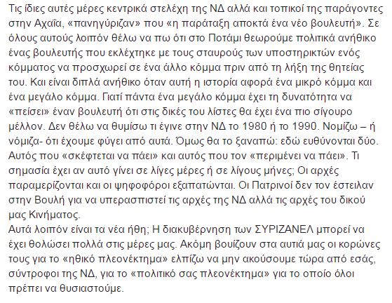 Τις ίδιες αυτές μέρες κεντρικά στελέχη της ΝΔ αλλά και τοπικοί της παράγοντες στην Αχαΐα, «πανηγύριζαν» που «η παράταξη αποκτά ένα νέο βουλευτή». Σε όλους αυτούς λοιπόν θέλω να πω ότι στο Ποτάμι θεωρούμε πολιτικά ανήθικο ένας βουλευτής που εκλέχτηκε με τους σταυρούς των υποστηρικτών ενός κόμματος να προσχωρεί σε ένα άλλο κόμμα πριν από τη λήξη της θητείας του. Και είναι διπλά ανήθικο όταν αυτή η ιστορία αφορά ένα μικρό κόμμα και ένα μεγάλο κόμμα. Γιατί πάντα ένα μεγάλο κόμμα έχει τη δυνατότητα να «πείσει» έναν βουλευτή ότι στις δικές του λίστες θα έχει ένα πιο σίγουρο μέλλον. Δεν θέλω να θυμίσω τι έγινε στην ΝΔ το 1980 ή το 1990. Νομίζω – ή νόμιζα- ότι έχουμε φύγει από αυτά. Όμως θα το ξαναπώ: εδώ ευθύνονται δύο. Αυτός που «σκέφτεται να πάει» και αυτός που τον «περιμένει να πάει». Τι σημασία έχει αν αυτό γίνει σε λίγες μέρες ή σε λίγους μήνες; Οι αρχές παραμερίζονται και οι ψηφοφόροι εξαπατώνται. Οι Πατρινοί δεν τον έστειλαν στην Βουλή για να υπερασπιστεί τις αρχές της ΝΔ αλλά τις αρχές του δικού μας Κινήματος.