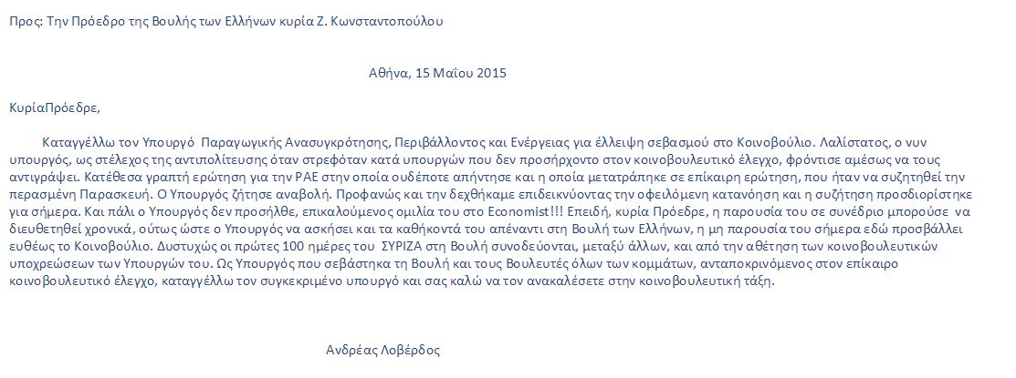 Τα «πυρά» τους προς τον Παναγιώτη Λαφαζάνη έστρεψε ο Ανδρέας Λοβέρδος μιλώντας στη Βουλή, με αφορμή την απουσία του υπουργού Παραγωγικής Ανασυγκρότησης, Περιβάλλοντος και Ενέργειας από τον κοινοβουλευτικό έλεγχο. Μάλιστα, ο βουλευτής του ΠΑΣΟΚ κατέθεσε και επιστολή καταγγελίας στο προεδρείο για την απουσία του κ. Λαφαζάνη.
