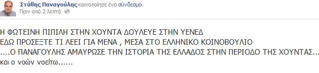Βολές κατά της Φωτεινής Πιπιλή εξαπέλυσε πριν από λίγο ο Στάθης Παναγούλης με σχόλιο που ανήρτησε στην προσωπική του σελίδα στο Facebook.
