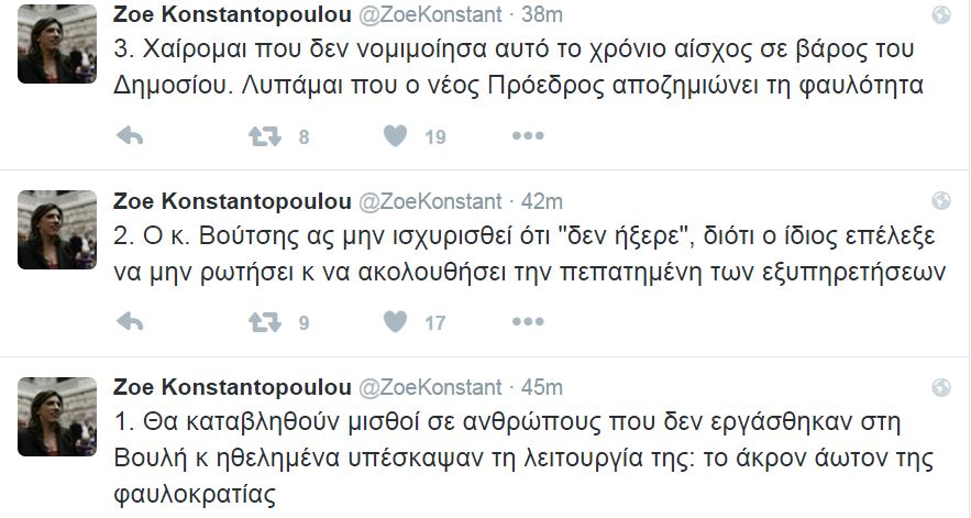 Τα “βέλη” της εναντίον του προέδρου της Βουλής, Νίκου Βούτση εξαπολύει η Ζωή Κωνσταντοπούλου με αφορμή την ανανέωση των συμβάσεων των υπαλλήλων της Βουλής.