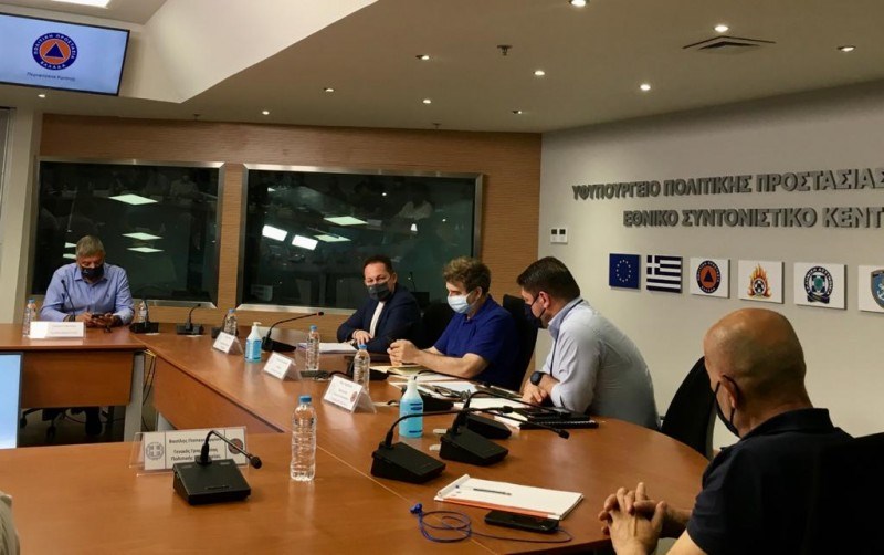 Ολοκληρώθηκε η ευρεία, έκτακτη σύσκεψη στο Κέντρο Επιχειρήσεων της Πολιτικής Προστασίας που πραγματοποιήθηκε υπό τον Υπουργό Προστασίας του Πολίτη, Μιχάλη Χρυσοχοΐδη και τον Υφυπουργό Πολιτικής Προστασίας και Διαχείρισης Κρίσεων, Νίκο Χαρδαλιά, παρουσία του Αναπληρωτή Υπουργού Εσωτερικών αρμόδιου για θέματα Αυτοδιοίκησης, Στέλιου Πέτσα, του Περιφερειάρχη Αττικής, Γιώργου Πατούλη, καθώς και του Αντιπεριφερειάρχη Αττικής αρμόδιου για την Πολιτική Προστασία, Βασίλειου Κόκκαλη, με αντικείμενο τη συγκεκριμενοποίηση των εργασιών προληπτικού χαρακτήρα από πλευράς των Δήμων της Αττικής στις 18 περιοχές που έχουν κηρυχθεί σε Κατάσταση Ειδικής Κινητοποίησης Πολιτικής Προστασίας.