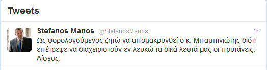 Με αναρτήσεις στο twitter ο Άδωνις Γεωργιάδης και ο Στέφανος Μάνος κατακρίνουν τον υπουργό Παιδείας για την απόφασή του να …ακυρώσει το Νόμο Διαμαντοπούλου.«Θέλω να δηλώσω δημοσίως την πλήρη μου διαφωνία με την απόφαση του κ. Μπαμπινιώτου να μήν εφαρμόσει τον Νόμο για τα ΑΕΙ! Λάθος!» αναφέρει ο Άδωνις Γεωργιάδης.«Ως φορολογούμενος ζητώ να απομακρυνθεί ο κ. Μπαμπινιώτης διότι επέτρεψε να διαχειριστούν εν λευκώ τα δικά λεφτά μας οι πρυτάνεις. Αίσχος» τονίζει σε δήλωσή του ο Στέφανος Μάνος.