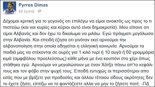 «Δέχομαι κριτική για το γεγονός ότι επιλέγω να είμαι ανοικτός ως προς το τι πιστεύω (και ναι κυρίες και κύριοι αυτό είναι δημοκρατία). Μου είπανε ότι είμαι Αλβανός και δεν έχω το δικαίωμα να μιλάω. Εγώ πράγματι μεγάλωσα στην Αλβανία. Και επειδή έζησα ό,τι γινόταν εκεί αρνούμαι την αλβανοποίηση στην οποία οδηγείται η ελληνική κοινωνία. Αρνούμαι τα παιδιά μας να στέκονται σε ουρές για 1 κιλό τυρί ή 10 αυγά ή 60 γραμμάρια κιμά (αμφιβόλου προελεύσεως) κάθε μήνα με ένα κουπόνι στο χέρι όπως στάθηκα εγώ. Αρνούμαι να μεγαλώσουν με έναν Χότζα πάνω από το κεφάλι τους και τον φόβο στην ψυχή τους. Επειδή ευτυχώς οι περισσότεροι από εσάς που με βρίζετε για προδοσίες και άλλου τέτοιου είδους ακρότητες δεν το έχετε ζήσει, ελπίζω να το φαντάζεστε αλλά να μην το ζήσετε ποτέ. –ΠΔ».
