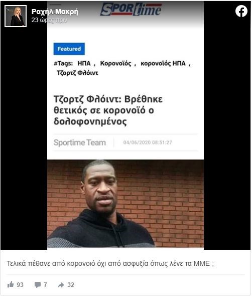Στην πρώτη ανάρτηση η πρώην βουλευτής αναρωτιέται εάν πρόκειται για δολοφονία ή αν ο Τζορτζ Φλόιντ πέθανε από… κορονοϊό. «Τελικά πέθανε από κορονοιό όχι από ασφυξία όπως λένε τα ΜΜΕ;», γράφει μεταξύ άλλων στα social media η πρώην βουλευτής η οποία δηλώνει οπαδός του Ντόναλντ Τραμπ.