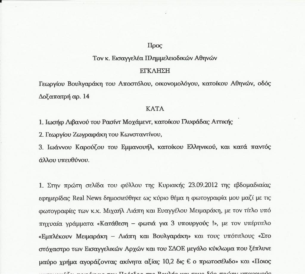 «Αναφέρομαι στο δημοσίευμα της εφημερίδας σας της 23.9.12 με τίτλο “Κατάθεση φωτιά για 3 Υπουργούς” στο οποίο γίνεται μνεία του ονόματος μου. Δεδομένου ότι ουδεμία σχέση έχω με τα αναγραφόμενα στο παραπάνω δημοσίευμα, το περιεχόμενο του οποίου πλήττει βάναυσα την τιμή και την υπόληψη εμού και της οικογενείας μου, σας καλώ να δημοσιεύσετε άμεσα την παρούσα για την ενημέρωση των αναγνωστών σας.
