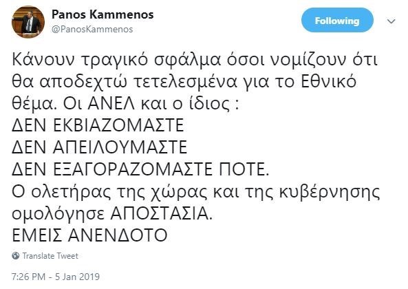 Με ανάρτησή του στο twitter έστειλε μήνυμα ότι δεν πρόκειται να αποδεχθεί τα τετελεσμένα της Συμφωνίας των Πρεσπών, λέγοντας χαρακτηριστικά: «Κάνουν τραγικό σφάλμα όσοι νομίζουν ότι θα αποδεχθώ τετελεσμένα για το Εθνικό θέμα».