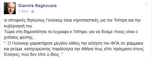 Την σκληρή κριτική που άσκησε στην ελληνική κυβέρνηση και στον Πρωθυπουργό Αλέξη Τσίπρα, ο Πρόεδρος της Κομισιόν, Ζαν Κλοντ Γιούνκερ, σχολίασε ο Γιάννης Ραγκούσης, με ανάρτηση του στον προσωπικό του λογαριασμό στο Facebook, κάνοντας λόγο για ντροπιαστικές δηλώσεις. Συγκεκριμένα, ο κ. Ραγκούσης, έγραψε: