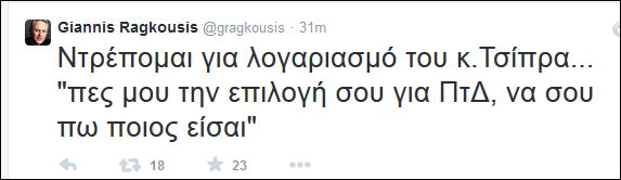 Τη δυσαρέσκεια του για την απόφαση του Αλέξη Τσίπρα να προτείνει τον Προκόπη Παυλόπουλο για Πρόεδρο της Δημοκρατίας εξέφρασε μέσω Twitter ο Γιάννης Ραγκούσης.