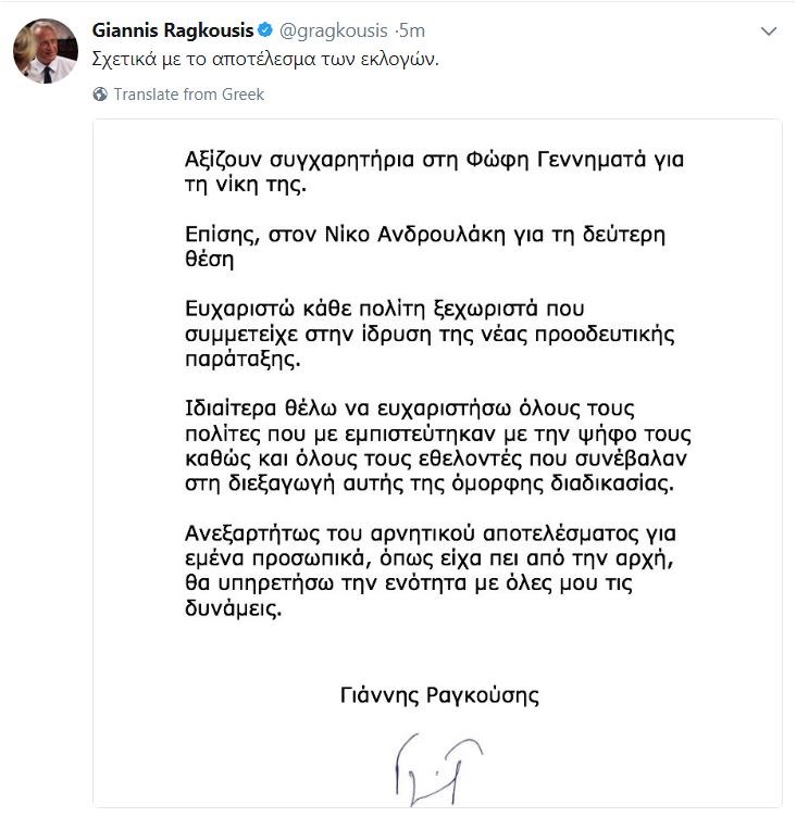 Λίγα λεπτά πριν από τη μία μετά τα μεσάνυχτα, ο Γιάννης Ραγκούσης, ανέβασε στο twitter την γραπτή του ανακοίνωση, όσο αφορά το εκλογικό αποτέλεσμα για την διεκδίκηση της ηγεσίας του νέου φορέα της Κεντροαριστεράς.