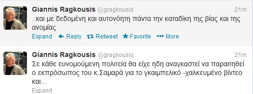 “Σε κάθε ευνομούμενη πολιτεία θα είχε ηδη αναγκαστεί να παραιτηθεί ο εκπρόσωπος του κ.Σαμαρά για το γκαιμπελικό -χαλκευμένο βίντεο και με δεδομένη και αυτονόητη πάντα την καταδίκη της βίας και της ανομίας”, έγραψε στο Twitter ο πρώην υπουργός.
