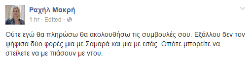 Μέσω του λογαριασμού της στο Facebook, η πρώην βουλευτής Ραχήλ Μακρη διαμηνύει οτι δεν θα πληρώσει τον ΕΝΦΙΑ και καλεί τα μέλη της κυβέρνησης να «στείλετε να με πιάσουν με ντου». Η κ. Μακρή ανεβασε μάλιστα ένα βίντεο από παλαιότερη εκπομπή στην οποία ο Πάνος Καμμένος είχε δηλώσει οτι δεν πρόκειται να πληρώσει τον ΕΝΦΙΑ.