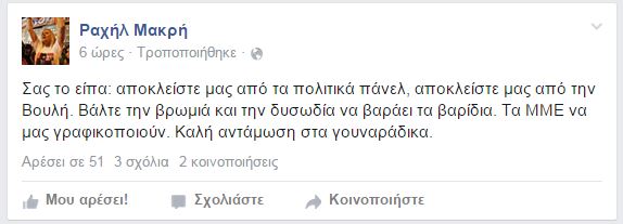 Τη φράση που χρησιμοποιούσε ο Άρης Βελουχιώτης και που είχε πει στη βουλή ο Βαγγέλης Διαμαντόπουλος, προκαλώντας αντιδράσεις, επικαλέστηκε η Ραχήλ Μακρήσε ανάρτησή της στο Facebook.