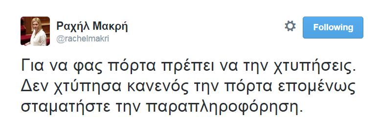 “Για να φας πόρτα πρέπει να την χτυπήσεις. Δεν χτύπησα κανενός την πόρτα επομένως σταματήστε την παραπληροφόρηση” έγραψε χαρακτηριστικά στο λογαριασμό της στο twitter η Ραχήλ Μακρή.
