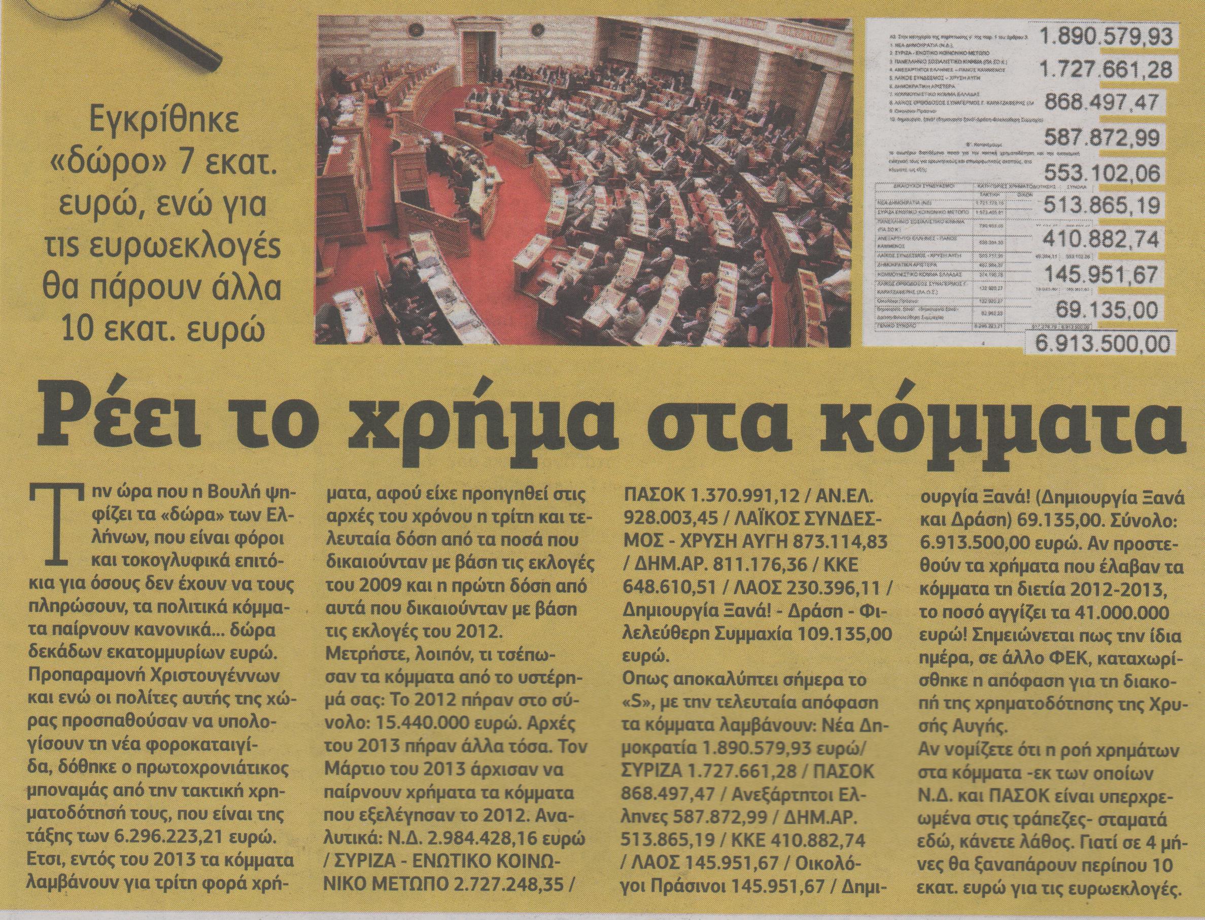 Την ώρα που η Βουλή ψηφίζει τα “δώρα” των Ελλήνων, που είναι φόροι και επιτόκια για όσους δεν έχουν να τους πληρώσουν, τα πολιτικά κόμματα παίρνουν κανονικά… δώρα δεκάδων εκατομμυρίων ευρώ.