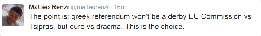 «Το θέμα είναι: Το ελληνικό δημοψήφισμα δεν θα είναι ένα ντέρμπι ανάμεσα στην Ευρωπαϊκή Επιτροπή και τον Τσίπρα, αλλά στο ευρώ και τη δραχμή. Αυτή είναι η επιλογή», έγραψε ο Ματέο Ρέντσι.