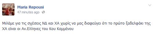 Συνεχίζεται η κόντρα ανάμεσα στα στελέχη της Δημοκρατικής Αριστεράς και των Ανεξάρτητων Ελλήνων καθώς μετά την διαμάχη ΠαπαδόπουλουΚαμμένου, απάντηση στην επίθεση που δέχτηκε από τον πρόεδρο των ΑΝΕΛ έδωσε και η Μαρία Ρεπούση. Η βουλευτής της ΔΗΜΑΡ με ανάρτηση στον προσωπικό της λογαριασμό στο Facebook άφησε αιχμές για τις σχέσεις των Ανεξάρτητων Ελλήνων με την Χρυσή Αυγή χαρακτηρίζοντας το κόμμα των ΑΝΕΛ ως «πρώτο ξαδελφάκι» της Χρυσής Αυγής.