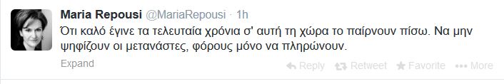 “Ότι καλό έγινε τα τελευταία χρόνια σ’ αυτή τη χώρα το παίρνουν πίσω. Να μην ψηφίζουν οι μετανάστες, φόρους μόνο να πληρώνουν” έγραψε η βουλευτής της ΔΗΜΑΡ Μαρία Ρεπούση στο Twitter σχολιάζοντας προφανώς την τροπολογία την ψήφο των μεταναστών.
