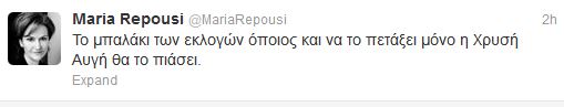 “Το μπαλάκι των εκλογών όποιος και να το πετάξει μόνο η Χρυσή Αυγή θα το πιάσει”, έγραψε στο λογαριασμό της στο Twitter.