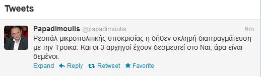 Πρωινό σχόλιο με ειρωνική χροιά προς τη κυβέρνηση.Ο Δημήτρης Παπαδημούλης με σχόλιό του νωρίτερα στον προσωπικό του λογαριασμό στο Twitter, κάνει λόγο για ρεσιτάλ υποκρισίας:«Ρεσιτάλ μικροπολιτικής υποκρισίας η δήθεν σκληρή διαπραγμάτευση με την Τροικα. Και οι 3 αρχηγοί έχουν δεσμευτεί στο Ναι, άρα είναι δεμένοι».