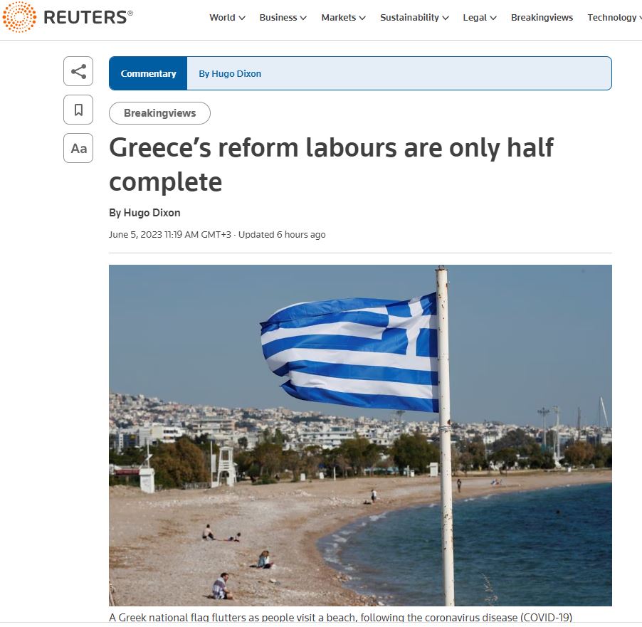 «Είναι αλήθεια ότι η ελληνική οικονομία γνώρισε την ταχύτερη ανάκαμψη από την πανδημία του Covid-19 και μετά σε σχέση με τις περισσότερες χώρες της Ευρωπαϊκής Ένωσης, σημειώνοντας σωρευτική αύξηση 15% τα τελευταία δύο χρόνια. Αλλά αυτό οφείλεται εν μέρει στο ότι η χώρα επωφελήθηκε από τις μεταρρυθμίσεις που επέβαλαν το Διεθνές Νομισματικό Ταμείο και η ΕΕ ως το τίμημα τριών προγραμμάτων διάσωσης για το χρέος.