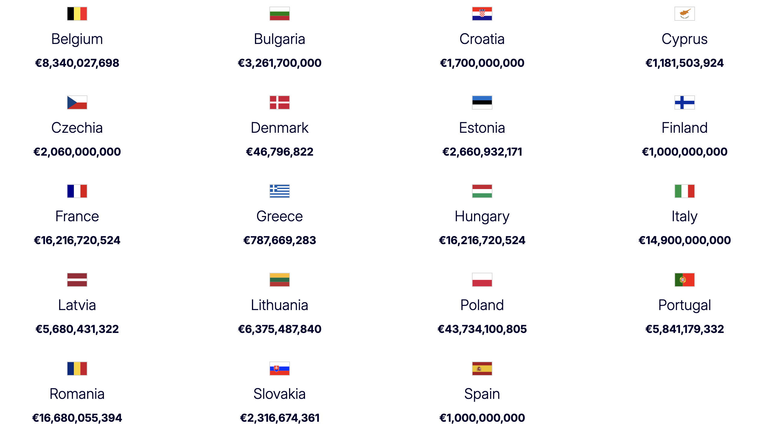 Αντίστοιχα, άλλες χώρες-μέλη της ΕΕ, που είχαν μήνες νωρίτερα πάρει την απόφαση συμμετοχής, κατέθεσαν φακέλους με τους οποίους κατάφεραν να εξασφαλίσουν πολύ μεγαλύτερη χρηματοδότηση, όπως η Κύπρος με 1,18 δισ., η Βουλγαρία με 3,2 δισ., η Ουγγαρία με 16,2 δισ., η όμοια πληθυσμιακά – και χωρίς να απειλείται από κάποιον – Πορτογαλία με 5,8 δισ. και την Πολωνία να εκτοξεύεται στα 43,7 δισ.