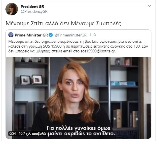 Παραθέτοντας τη σχετική ανάρτηση του Πρωθυπουργού Κυριάκου Μητσοτάκη για την καταπολέμηση της ενδοοικογενειακής βίας με κληση στη γραμμή SOS 15900, η Προεδρος της Δημοκρατίας Κατερίνα Σακελαροπούλου σημείωσε στο δικό της μήνυμα «Μένουμε Σπίτι αλλά δεν Μένουμε Σιωπηλές».