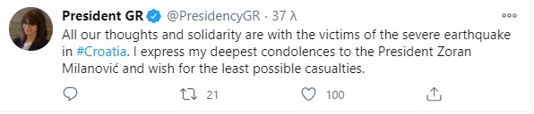 Με ανάρτηση στο twitter, η Πρόεδρος της Δημοκρατίας Κατερίνα Σακελλαροπούλου, εξέφρασε την αλληλεγγύη και τα θερμά της συλλυπητήρια προς τον Πρόεδρο της Κροατίας Ζόραν Μιλάνοβιτς για τα θύματα του σεισμού, που έπληξε την χώρα του, και ευχήθηκε όσο το δυνατό λιγότερες απώλειες.