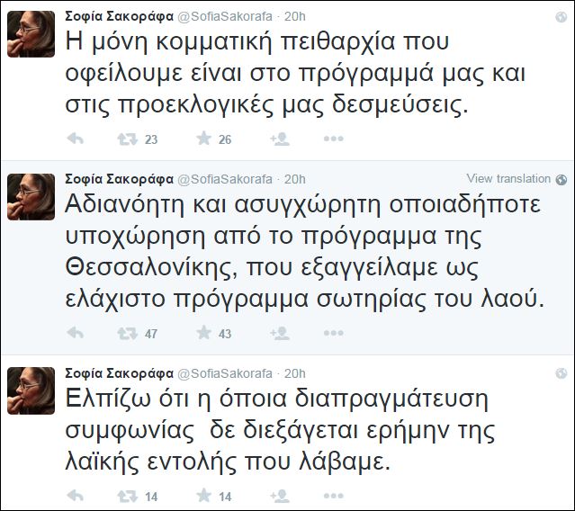 Αδιανόητη και ασυγχώρητη οποιαδήποτε υποχώρηση από το πρόγραμμα της Θεσσαλονίκης, που εξαγγείλαμε ως ελάχιστο πρόγραμμα σωτηρίας του λαού” έγραψε στο Twitter.