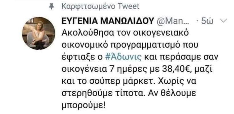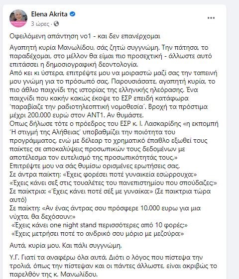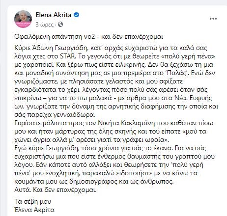Η Έλενα Ακρίτα επανήλθε σήμερα με δύο αναρτήσεις της. Στην πρώτη ζήτησε συγγνώμη από την Ευγενία Μανωλίδου, αφήνοντας ωστόσο αιχμές εναντίον της και στη δεύτερη αναφέρθηκε στον Άδωνι Γεωργιάδη.