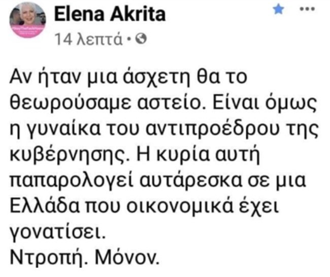 H Έλενα Ακρίτα αναδημοσίευσε το συγκεκριμένο tweet στον τοίχο της στο Facebook και επέκρινε με ιδιαίτερα καυστικό τρόπο την Ευγενία Μανωλίδου. Συγκεκριμένα έγραψε: