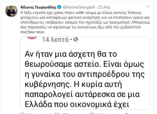 Ο Άδωνις Γεωργιάδης τοποθετήθηκε στο θέμα αρχικά μέσω twitter, όπου έγραψε: “Η λέξη ντροπή έχει χάσει πλέον κάθε νόημα με όλους αυτούς. Κάποιοι φτιάχνουν μία καταφανώς ψεύτικη ανάρτηση για να χτυπήσουν εμένα και υποτιθέμενος “σοβαρός” κόσμος την σχολιάζει ως πραγματική. Μπορούμε σας παρακαλώ να αφήσουμε τις οικογένειες έξω από τη χυδαιότητά σας; fakenews”.