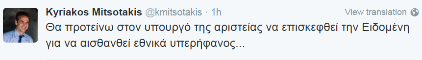 “Θα προτείνω στον υπουργό της αριστείας να επισκεφθεί την Ειδομένη για να αισθανθεί εθνικά υπερήφανος…” έγραψε στο Twitter ο πρόεδρος της ΝΔ Κυριάκος Μητσοτάκης.