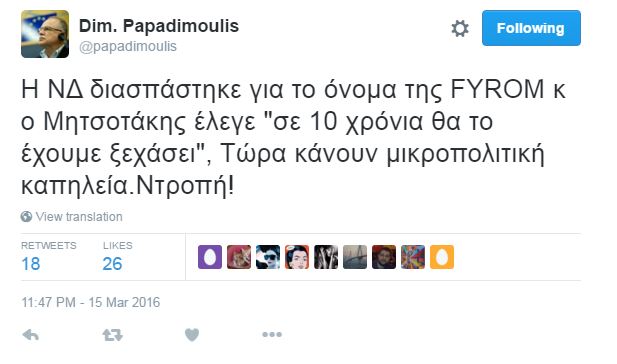 «Η ΝΔ διασπάστηκε για το όνομα της FYROM και ο Μητσοτάκης έλεγε “σε 10 χρόνια θα το έχουμε ξεχάσει”, Τώρα κάνουν μικροπολιτική καπηλεία. Ντροπή!»