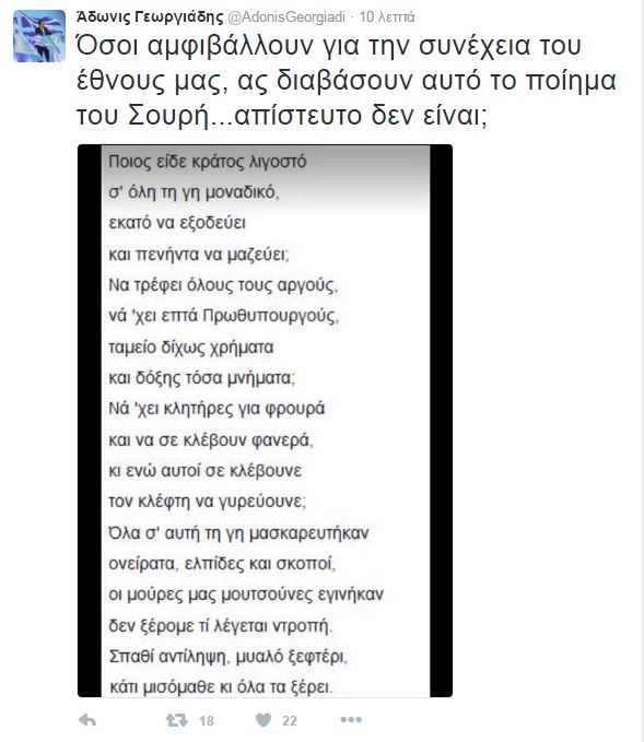 «Όσοι αμφιβάλλουν για την συνέχεια του έθνους μας, ας διαβάσουν αυτό το ποίημα του Σουρή… απίστευτο δεν είναι;» έγραψε στο Τwitter ο Άδωνις Γεωργιάδης, με αφορμή ότι ο Γιάννης Μουζάλας σε συνέντευξη του αποκάλεσε τα Σκόπια ως «Μακεδονία».