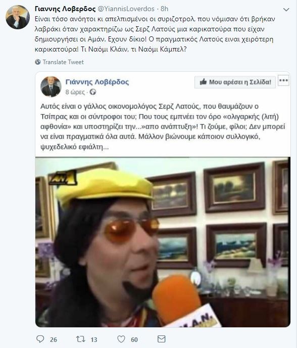 “Είναι τόσο ανόητοι κι απελπισμένοι οι συριζοτρολ, που νόμισαν ότι βρήκαν λαβράκι όταν χαρακτηρίζω ως Σερζ Λατούς μια καρικατούρα που είχαν δημιουργήσει οι Αμάν. Έχουν δίκιο! Ο πραγματικός Λατούς είναι χειρότερη καρικατούρα! Τι Ναόμι Κλάιν, τι Ναόμι Κάμπελ”, έγραψε στο Twitter.