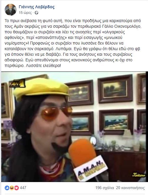 Ο κ. Λοβέρδος στην ανάρτηση που έκανε είχε φωτογραφία του Σωτήρη Καλυβάτση ως Μαέβιους Παχατουρίδη, ενός από τους ρόλους που υποδύθηκε στα σκετσάκια των ΑΜΑΝ.