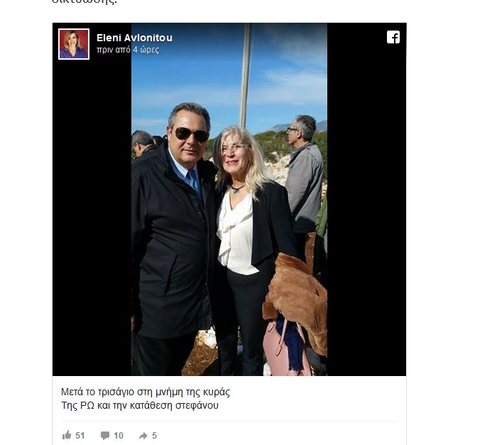 Αργότερα, ανέβασε και δεύτερη φωτογραφία, όπου ποζάρει δίπλα στον Πάνο Καμμένο και στην λεζάντα γράφει: «Μετά το τρισάγιο στην μνήμη της Κυράς της Τω και την κατάθεση στεφάνου».