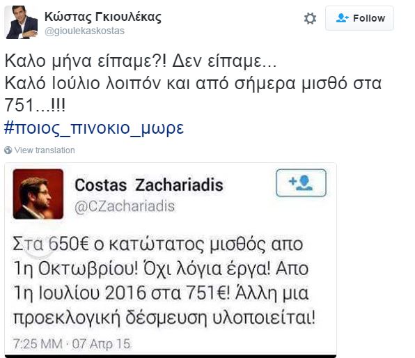 Την συγκεκριμένη ανάρτηση σχολίασε και ο Κώστας Γκιουλέκας μέσω του προσωπικού του λογαριασμού στο Twittter γράφοντας: «Καλό μήνα είπαμε; Δεν είπαμε… Καλό Ιούλιο λοιπόν και από σήμερα μισθό στα 751… #ποιος Πινόκιο μωρέ».