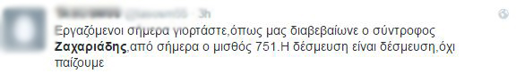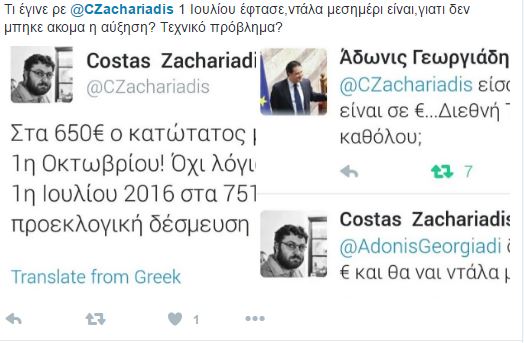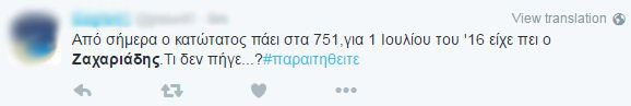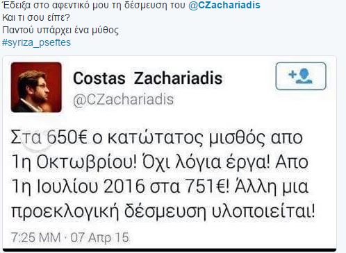 Φωτιά έχουν πάρει τα μέσα κοινωνικής δικτύωσης με μία ανάρτηση που είχε κάνει τον Απρίλιο του 2015, στο Twitter, ο Διευθυντής της Κοινοβουλευτικής Ομάδας του ΣΥΡΙΖΑ, Κώστας Ζαχαριάδης, στην οποία έγραφε ότι από την 1η Ιουλίου ο κατώτατος μισθός θα είναι 751 ευρώ.