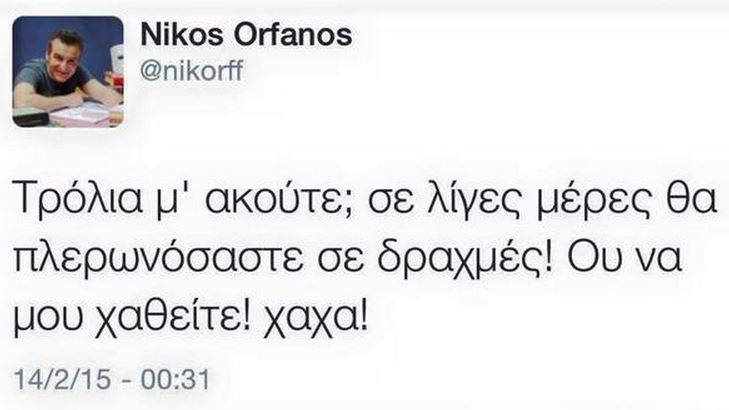 «Τρόλια μ’ ακούτε; σε λίγες μέρες θα πλερωνόσαστε σε δραχμές! Ου να μου χαθείτε! χαχα!», έγραψε χαρακτηριστικά με πολλούς από τους χρήστες να αντιδρούν αρνητικά.