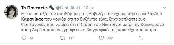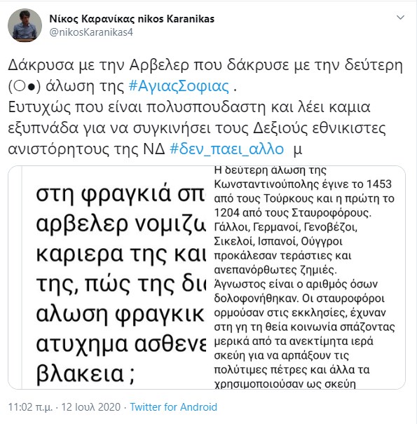 Ο Νίκος Καρανίκας έγραψε σχολιάζοντας τη δήλωσή της κ. Αρβελέρ: “Δάκρυσα με την Αρβελέρ που δάκρυσε με την δεύτερη (○●) άλωση της #ΑγιαςΣοφιας . Ευτυχώς που είναι πολυσπούδαστη και λέει καμία εξυπνάδα για να συγκινήσει τους Δεξιούς εθνικιστές ανιστόρητους της ΝΔ #δεν_παει_αλλο