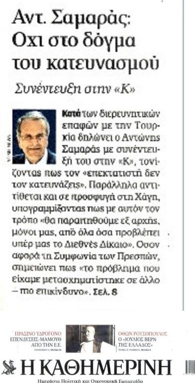 Ο Αντώνης Σαμαράς σε συνέντευξη που παραχώρησε στην “Καθημερινή της Κυριακής”, ξεκαθάρισε ότι είναι κατά των διερευνητικών επαφών με την Τουρκία, ενώ αντιτίθεται και στο ενδεχόμενο προσφυγής στη Χάγη. “Με πειρατές δεν κάνεις διάλογο”, υπογραμμίζει μεταξύ άλλων ο πρώην πρωθυπουργός.