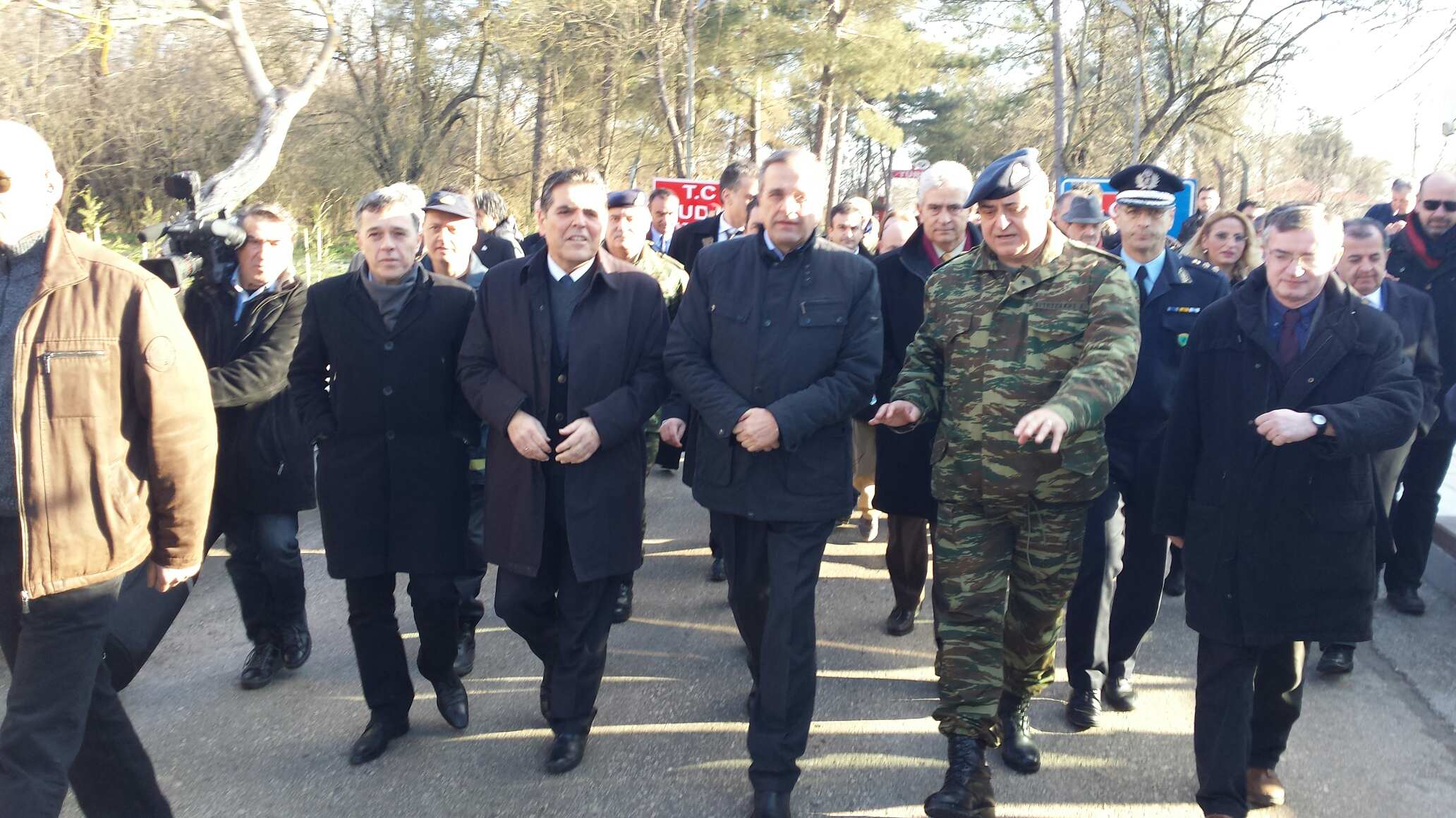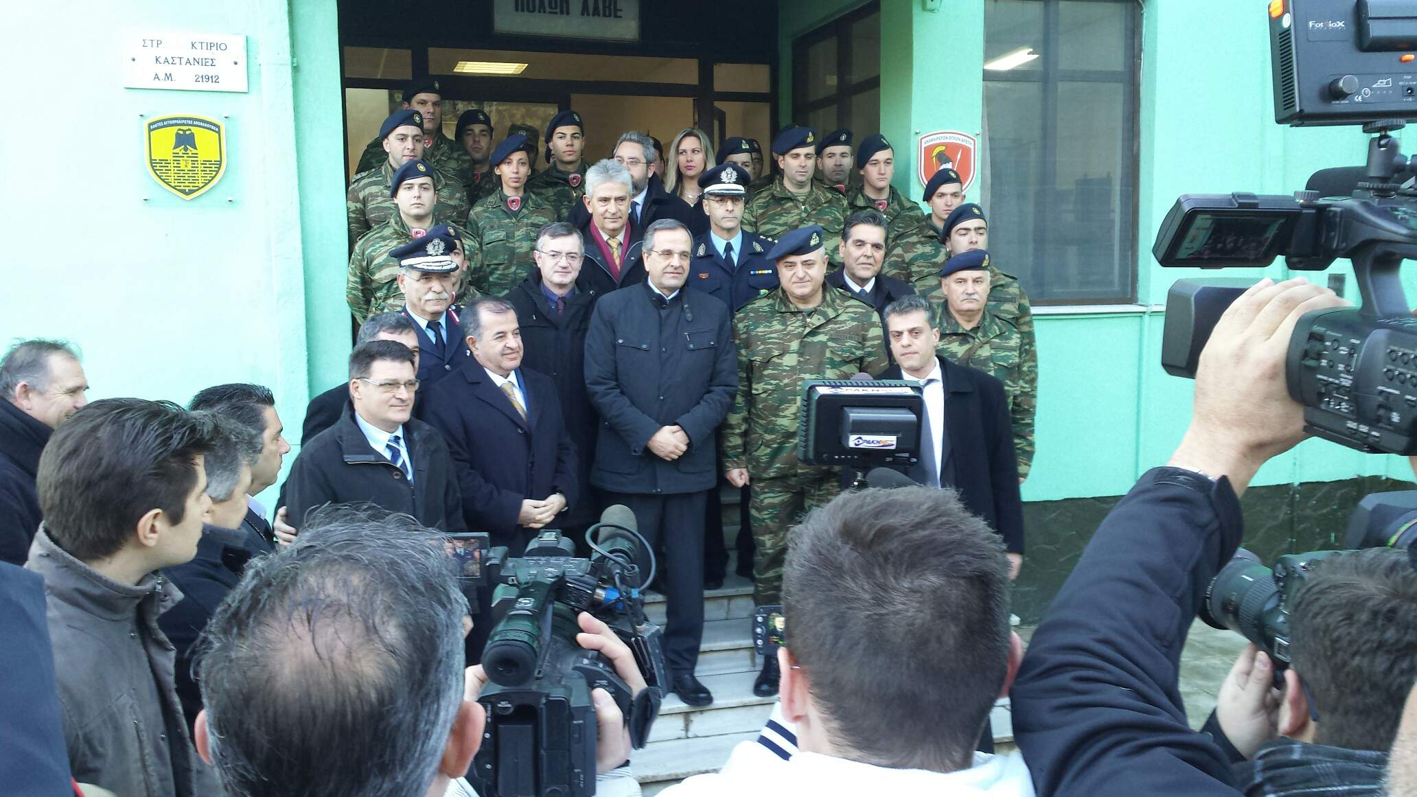 O Αντώνης Σαμαράς χαιρέτησε και αντάλλαξε ευχές με τους Έλληνες στρατιώτες που υπηρετούν στο φυλάκιο και στη συνέχεια προχώρησε μέχρι τη συνοριακή γραμμή, επιθεωρώντας τα οχυρωματικά έργα.