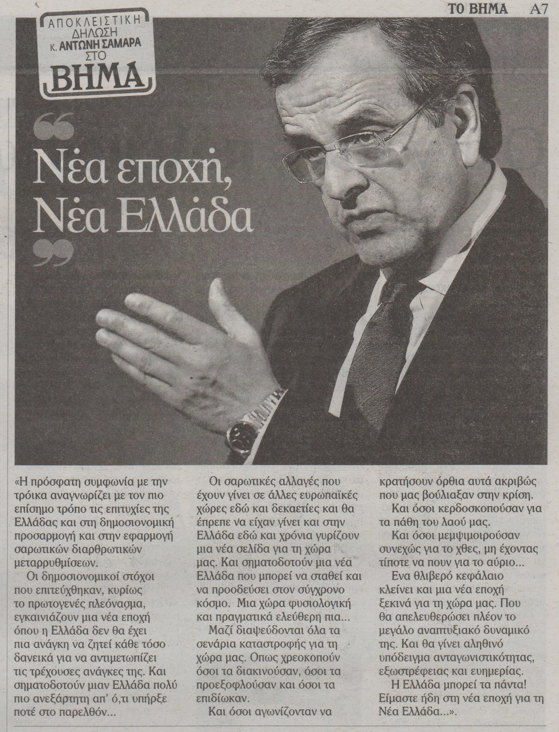 Για νέα εποχή για την Ελλάδα μετά από τη συμφωνία με την τρόικα κάνει λόγο ο Πρωθυπουργός Αντώνης Σαμαράς, σε δήλωσή του στο «Βήμα της Κυριακής».